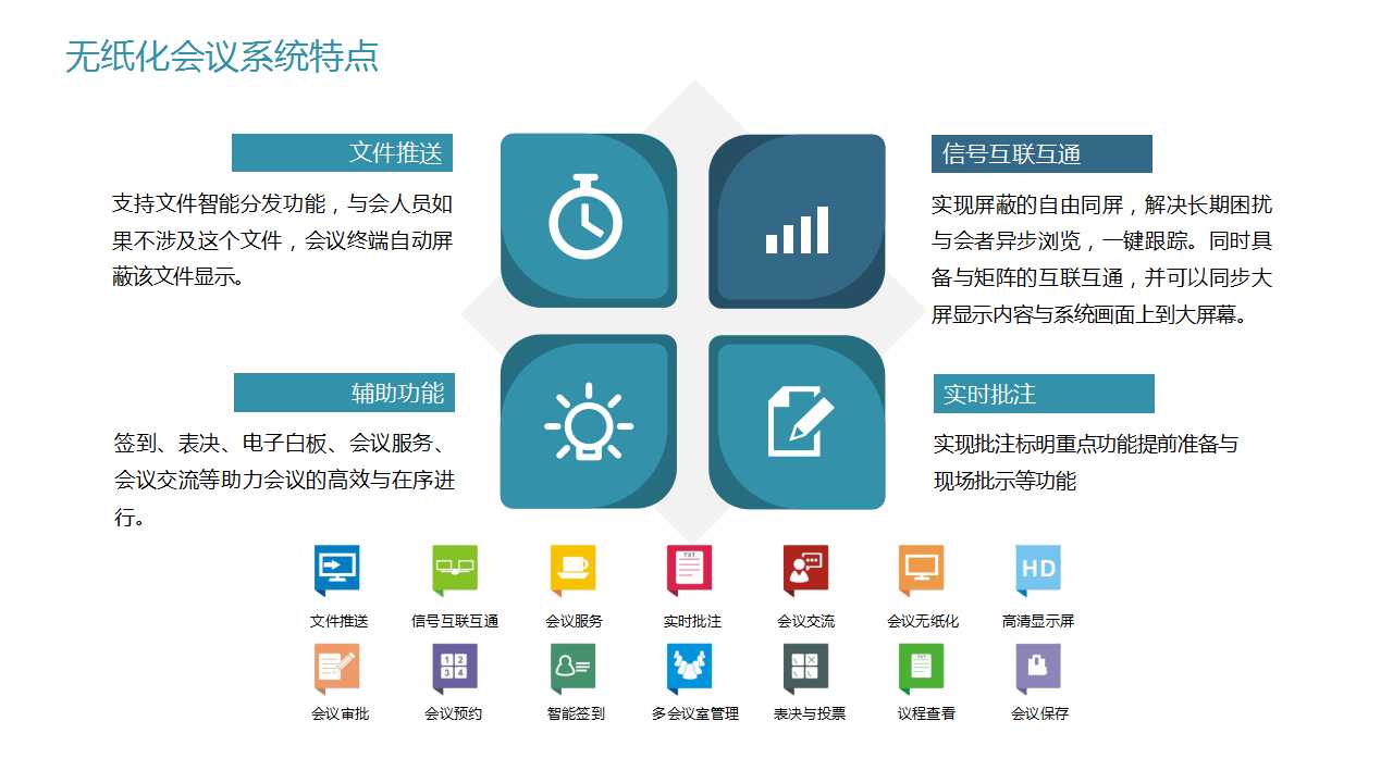 TENON無紙化會議系統(tǒng)概念的提出和運用實施使得會議從傳統(tǒng)的紙質(zhì)為信息記錄和拖沓的演講轉(zhuǎn)化成以顯示器為載體的數(shù)字化、簡約化、移動化的交互式多媒體會議。無紙化會議系統(tǒng)作為智能會議系統(tǒng)的一個重要組成部分,是運行在PC、平板電腦上的新一代會議系統(tǒng),本系統(tǒng)采用全新的會議模式,將傳統(tǒng)會議過程中的各個環(huán)節(jié)虛擬化、主體信息和承載介質(zhì)數(shù)字化,將多種信息化技術融入會議的各環(huán)節(jié)、貫穿會議全過程,將頻繁召開的會議全部搬上windows.安卓平臺,會議使用者在更短時間內(nèi)清晰了解、交流更多的會議內(nèi)容,完成多于以往的會議任務。