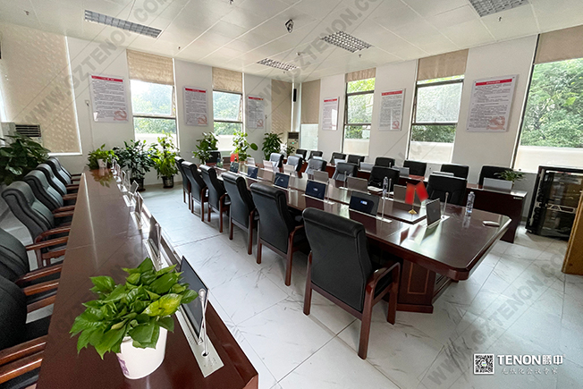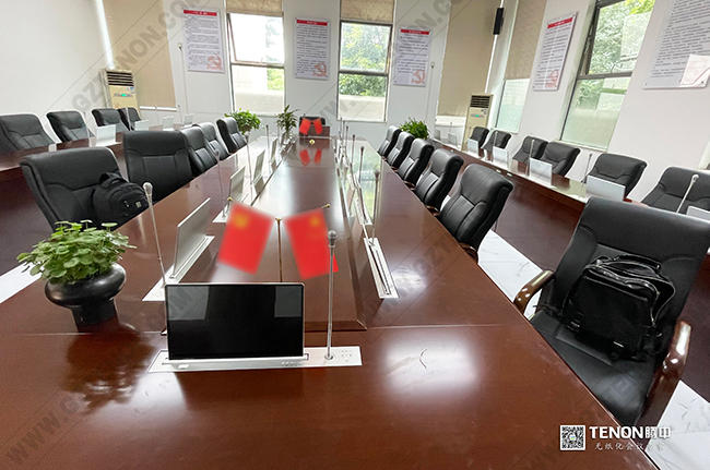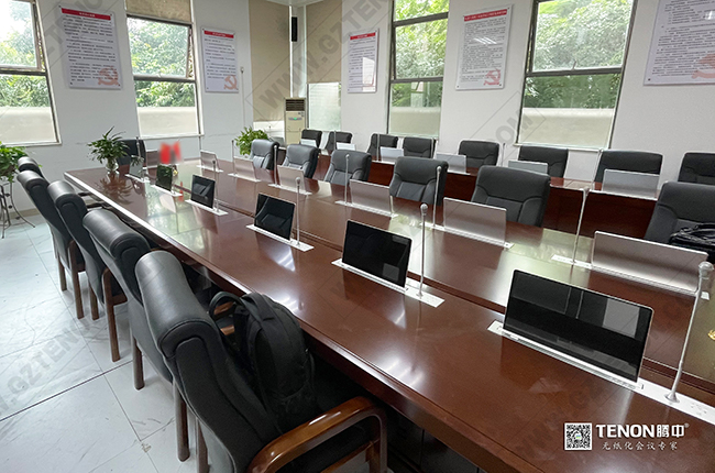 本次騰中為圖書館會議室設計的方案有無紙化會議系統、擴聲系統、數字會議系統、集中控制系統等。在整個會議過程中,由升降式無紙化會議系統為參會人員提供絕佳的數字化、綠色環保辦公,功能全面,界面層次簡單,操作流暢,體驗文稿滑屏、拖動、縮放等特效,所有的操作均通過一臺終端完成,簡化了紙質文件的使用。無紙化會議系統支持會議簽到表決投票支持原文件智能分發同步畫面及自由異步查看系統采用純網線組網支持電子白板、手寫批注支持自由交互等功能。
