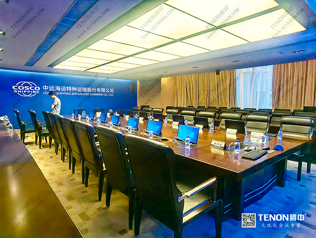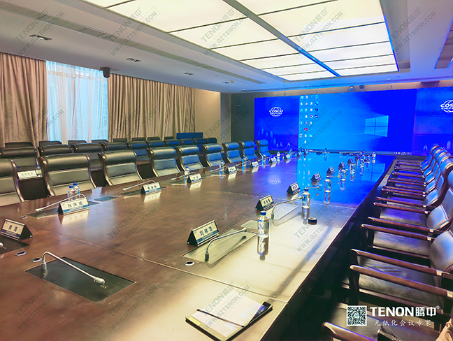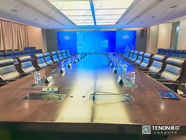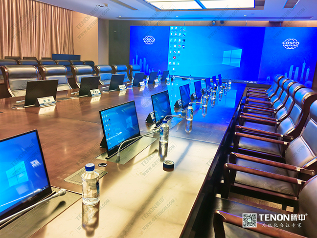 在政府機關、科研機構,和各企事業單位,每年各種會議較多,會議材料用紙量較大,印制等各種費用較高,人力及時間消耗較多,不僅增加成本,而且也不適應信息化時代的發展。同時與建設一個高效,節能,環保的社會也不相稱。無紙化不僅能大大提高工作效率,對環保節能也具有深遠的意義。本次對老舊會議室改造,更換原有的厚重顯示器,換成顯示屏與話筒一體的升降式顯示器,顯示屏在休會期間可下降隱藏,保持桌面整潔。定制的面板尺寸為客戶節省了會議桌的更換費用,貫徹落實環保理念。