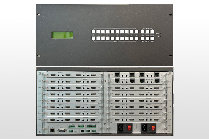 1. 采用嵌入式架構,無操作系統,最大支持32X32路HDMI/DVI-I/VGA/YCBCR/CVBS/SDI/HDBaseT/LC單模單纖光纖信號輸入、HDMI/DVI-I/VGA/YCBCR/CVBS/SDI/HDBaseT LC單模單纖光纖信號輸出;