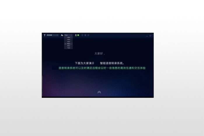 1.屏幕支持浮窗字幕的形式展示語(yǔ)音轉(zhuǎn)寫(xiě)文本內(nèi)容,同時(shí)設(shè) 置大屏字幕字號(hào),字幕位置可支持上停靠和下停靠,同時(shí)支 持顯示樣式有單行、雙行、三行、全屏等四種樣式。